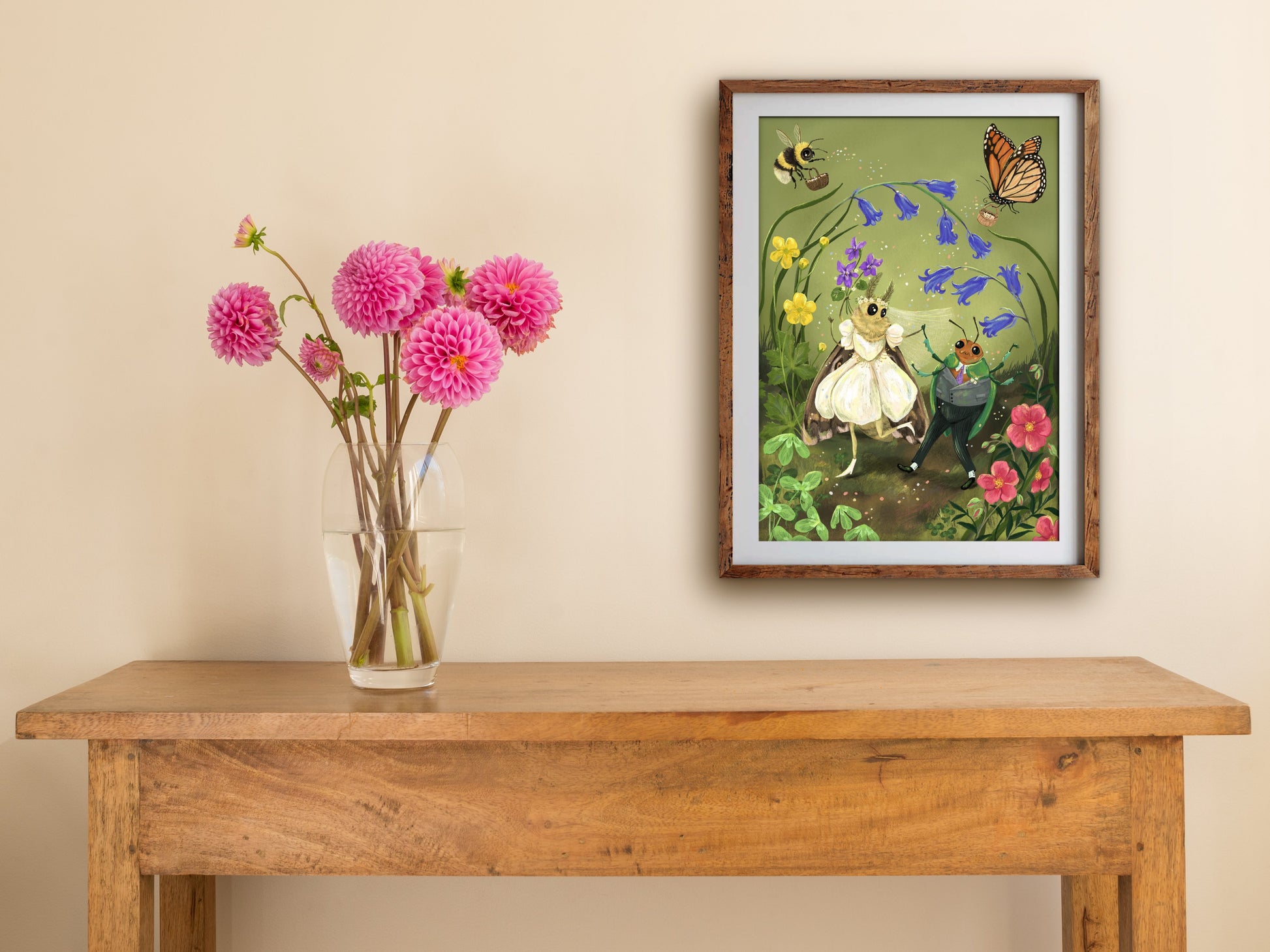 This print features an original illustration of the joyous wedding of Ms. Moth and Mr. Beetle. Each artwork is printed on demand on acid-free archival quality paper, and comes with a small white border to assist with framing.