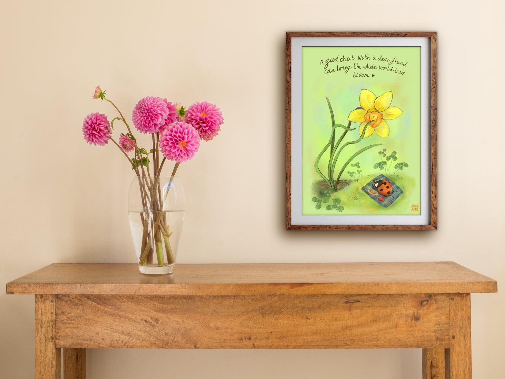 This print features an original illustration of Mademoiselles Daffodil and Ladybird hitting it off and enjoying a good natter in the sun. This artwork features the following words above the characters: "A good chat with a dear friend can bring the whole world into bloom." Each artwork is printed to demand on acid-free archival quality paper, and comes with a small white border to assist with framing.