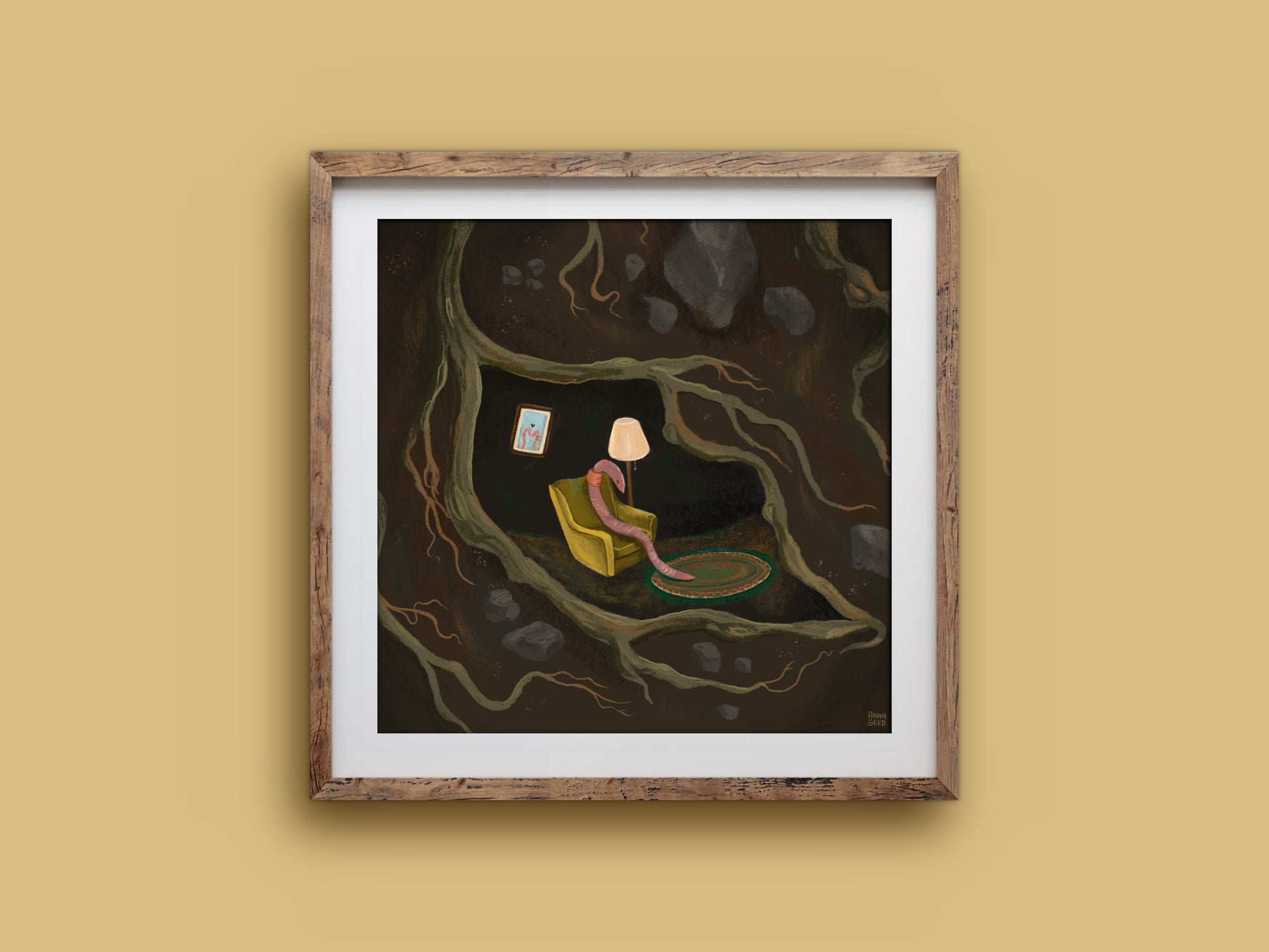 This print features an original illustration of a sweet little earthworm enjoying an evening nap in their armchair. Each artwork is printed to demand on acid-free archival quality paper, and comes with a small white border to assist with framing.