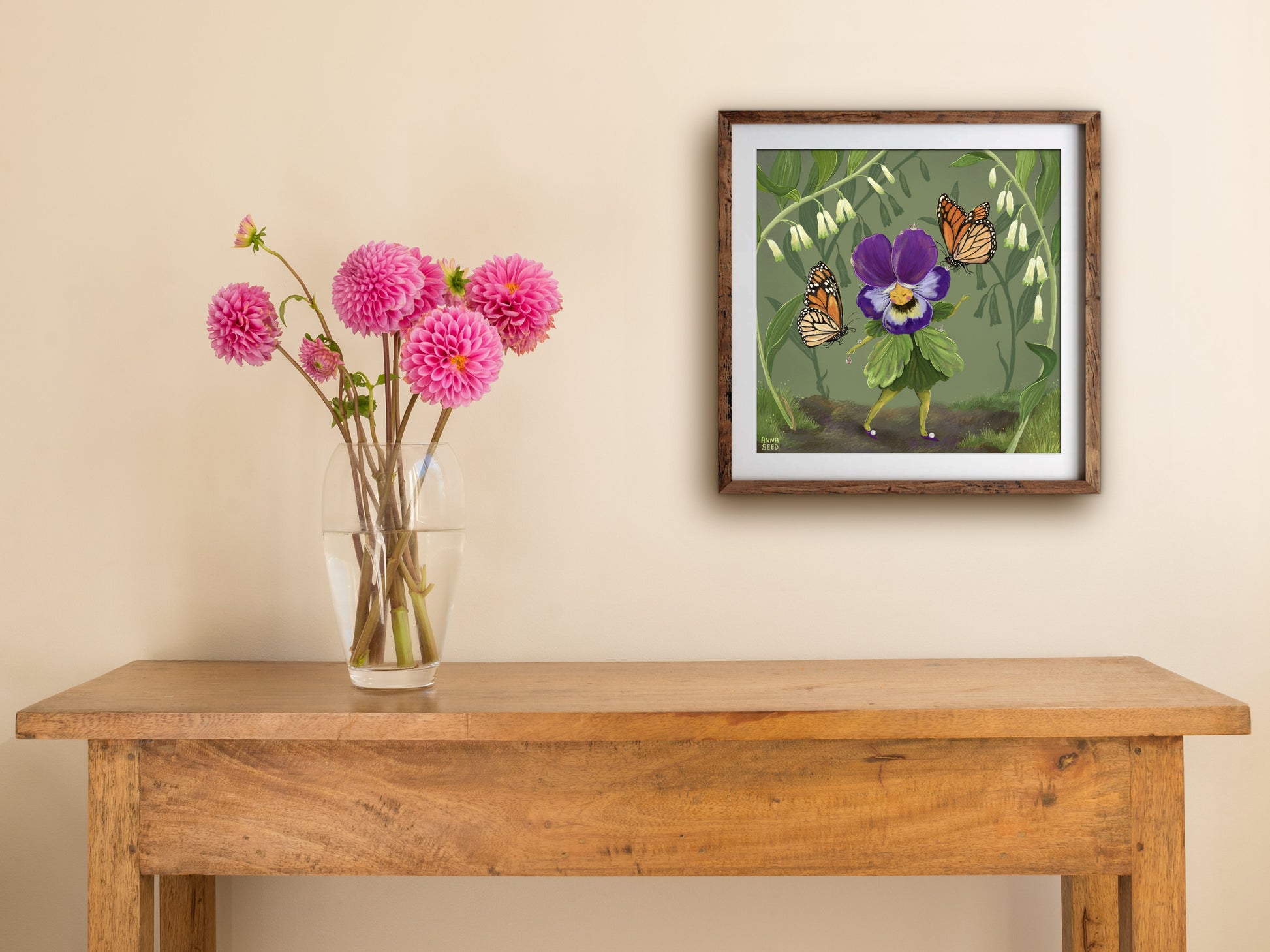 This print features an original illustration of thelovely Miss Pansy being adorned with dewdrops by admring butterflies. Each artwork is printed to demand on acid-free archival quality paper, and comes with a small white border to assist with framing.