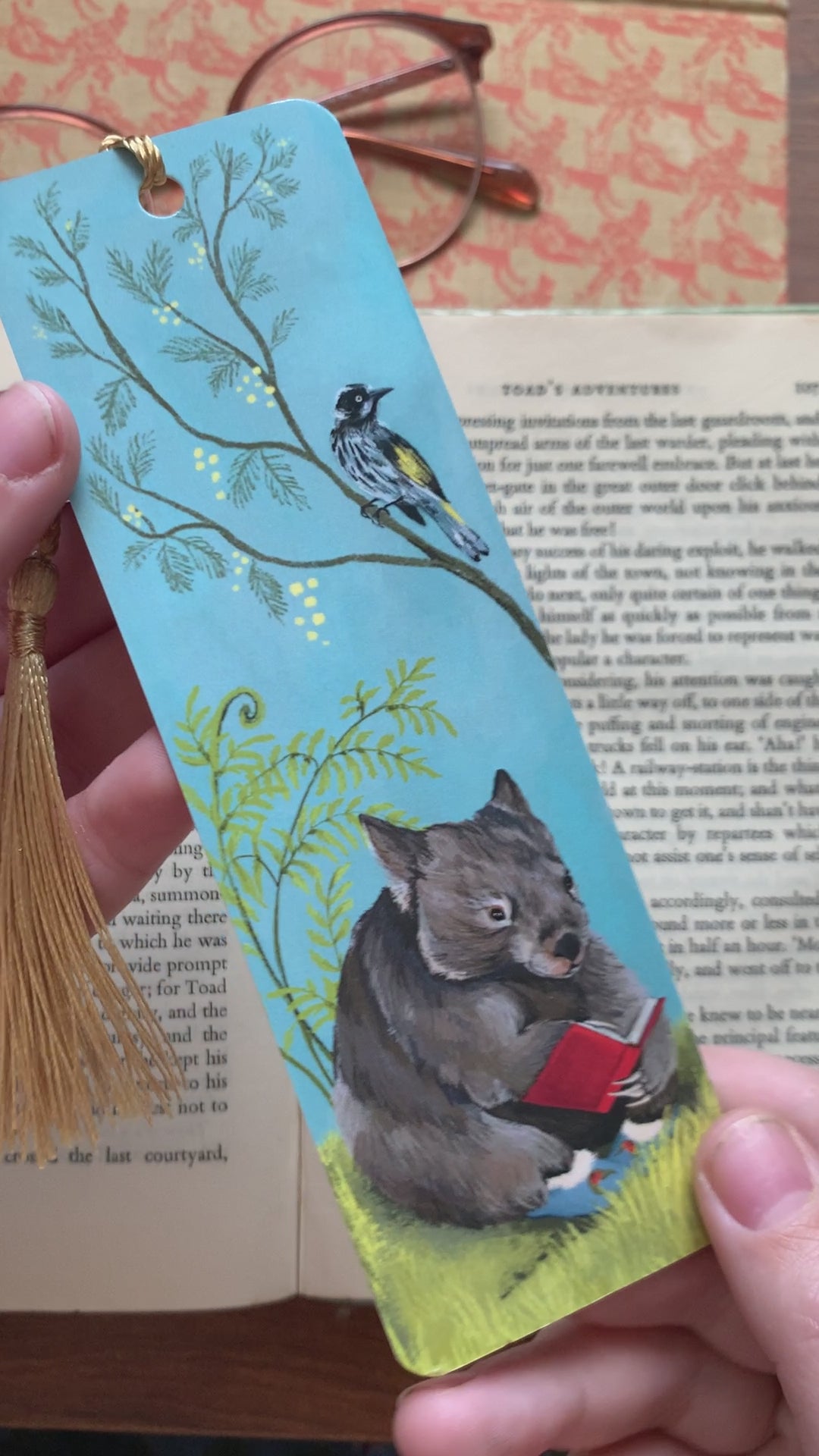This bookmark features an original Anna Seed illustration of a sweet wombat plonked down to enjoy a good read.