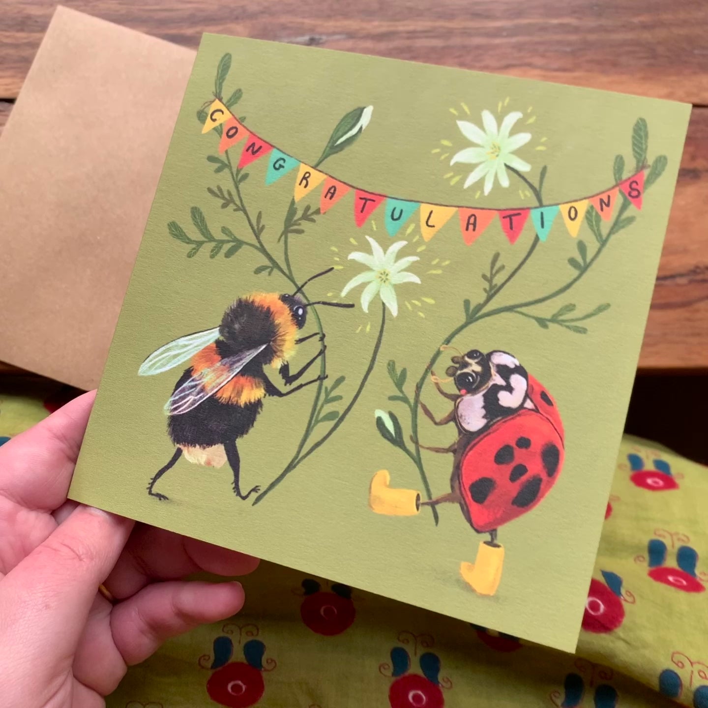 Congratulations! A blank square greeting card featuring an original Anna Seed illustration of a bumblebee and a ladybird carrying some celebratory bunting.