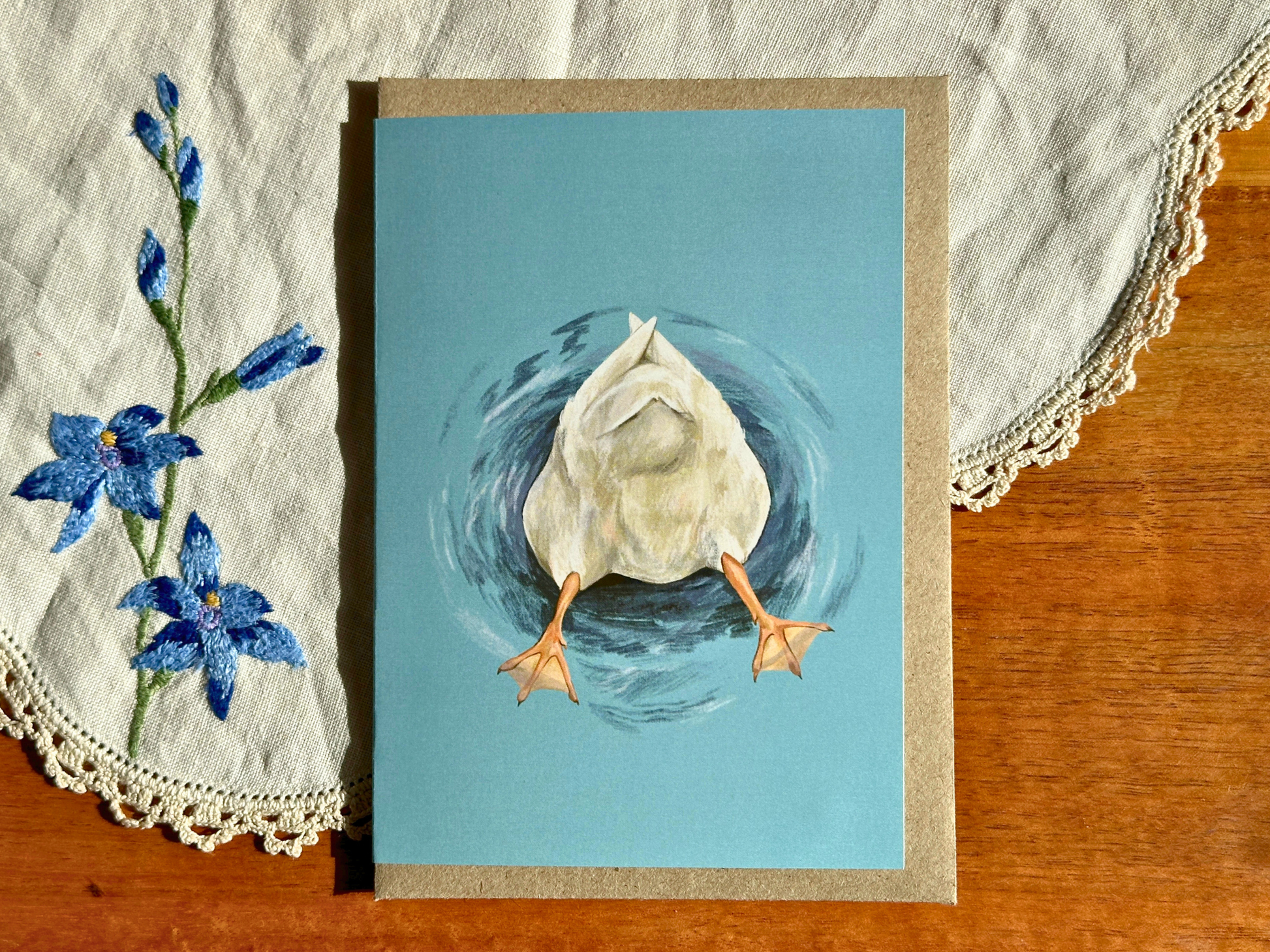 A blank greeting card featuring an original illustration of a duck happily dabbling around, head down in the water.