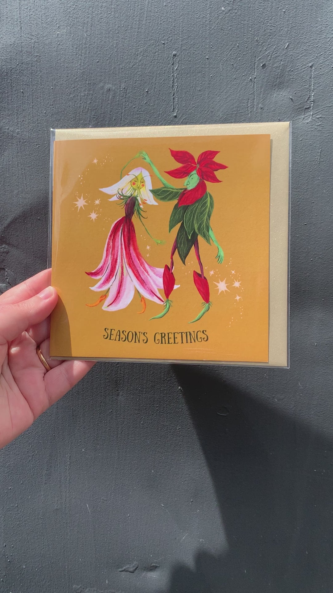 This is a blank square greeting card featuring an original seasonal Anna Seed Illustration of a delightful flower couple having a joyous Christmas dance. Made and printed in Melbourne, Australia, using 100% recycled paper, this card is 14.9 cm square and comes with a gold envelope, sealed in a cellophane bag for protection.