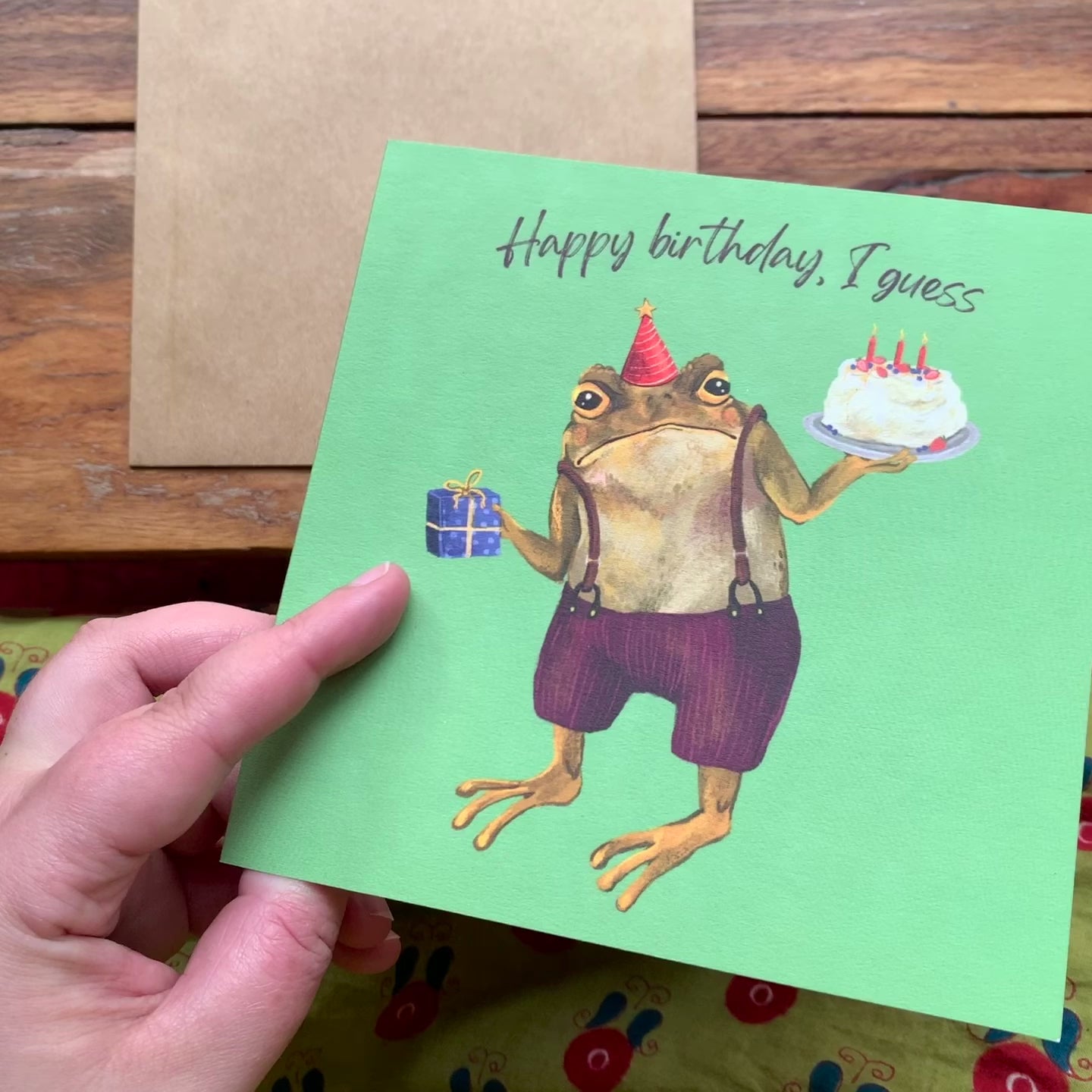 Happy Birthday, I guess. A blank square greeting card featuring an original Anna Seed illustration of a toad bringing out the cake at a birthday party! He doesn't seem too thrilled about it, though. But maybe that's just his face.