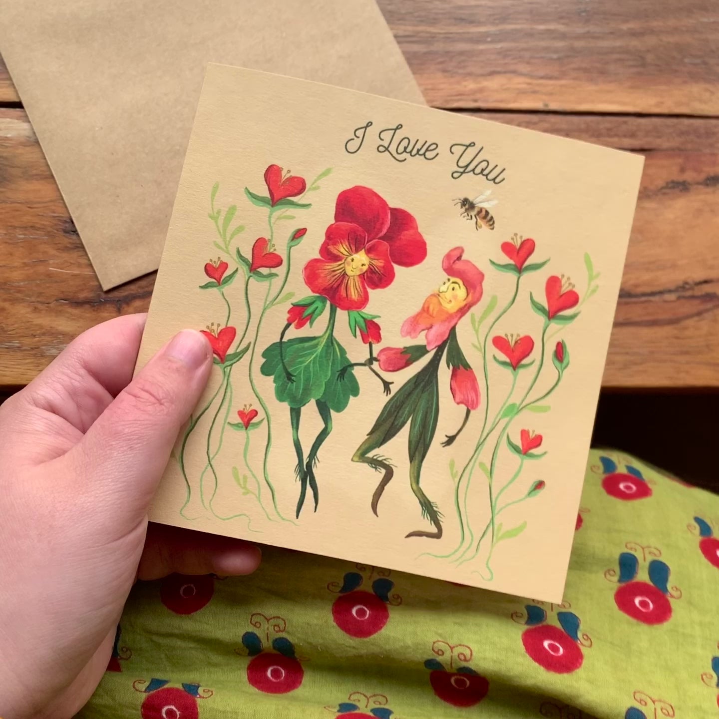 I love you. A blank square greeting card featuring an original Anna Seed illustration of a pansy lady and her snap dragon fella dancing arm in arm