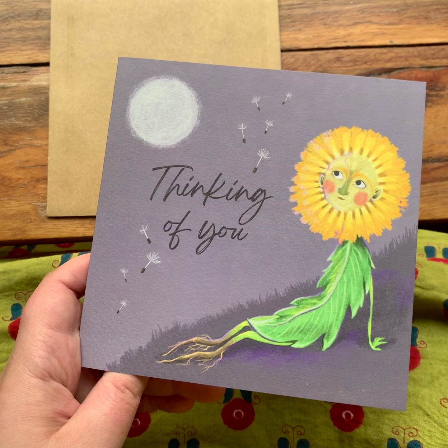 Thinking of you. A blank square greeting card featuring an original Anna Seed illustration of a dandelion sitting deep in thought.