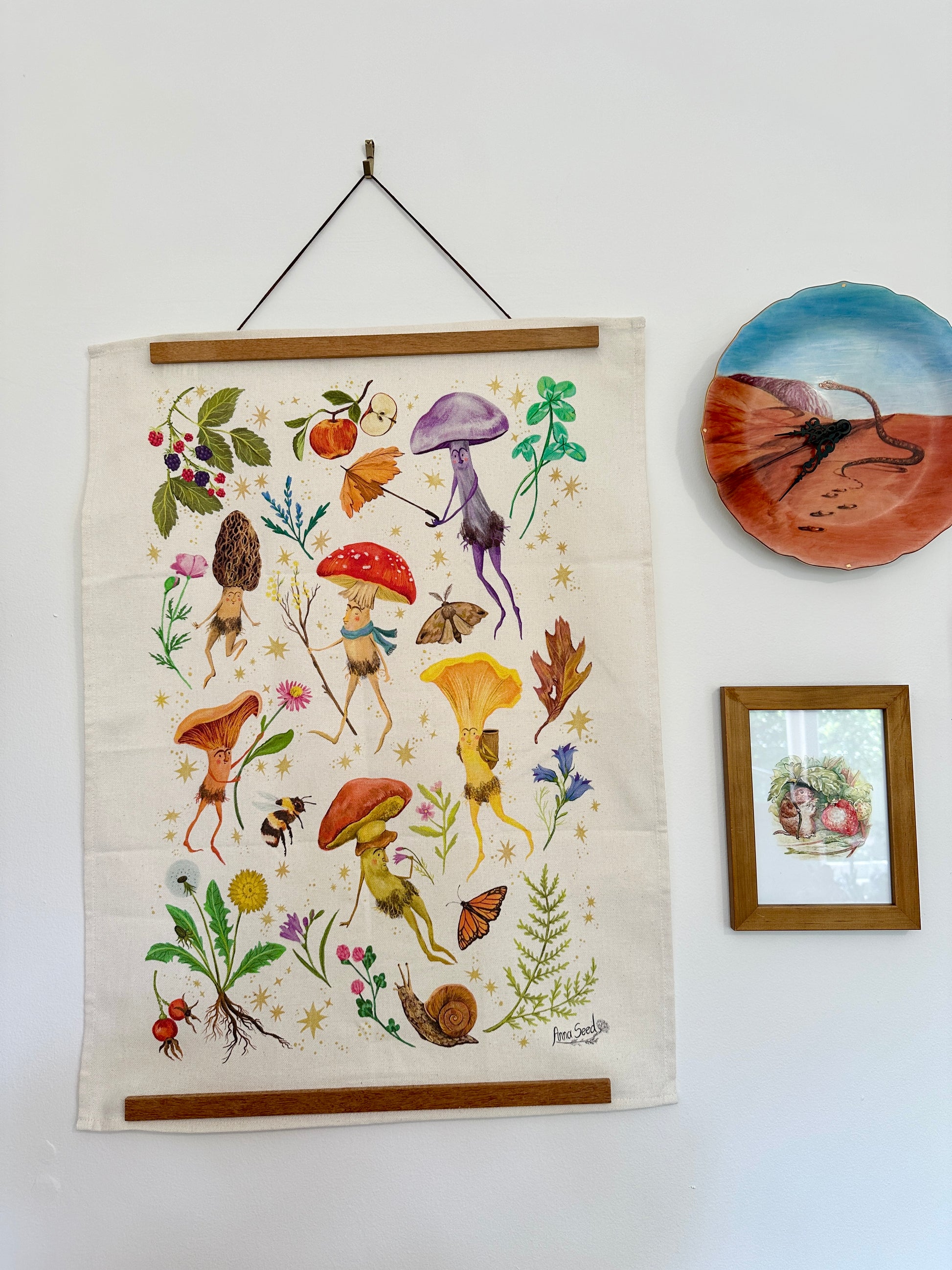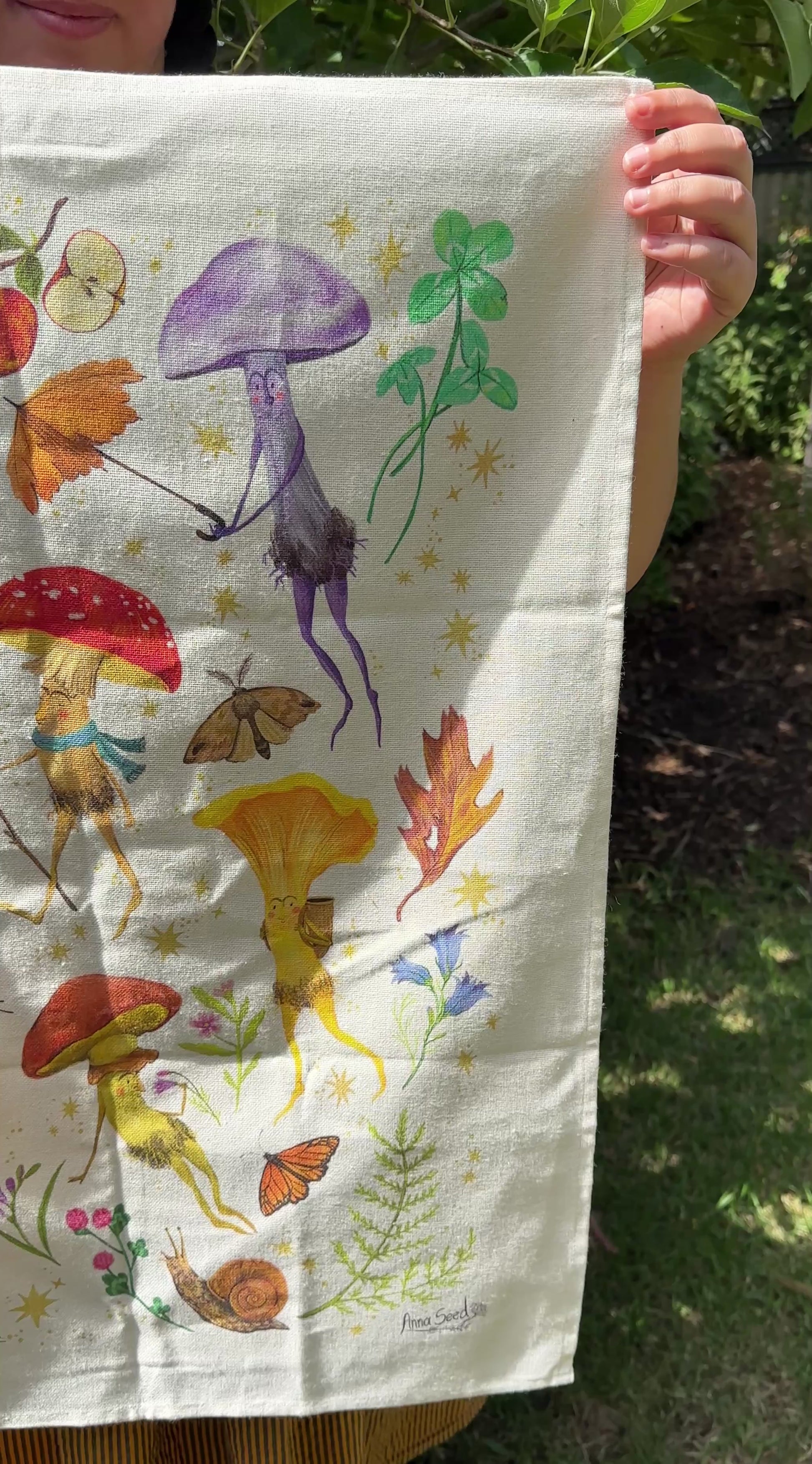 - This beautifully printed 100% natural cotton tea towel features an assortment of Anna Seed's best-loved mushroom characters! These tea towels are just as well-suited to being delightful wall hangings as they are for kitchen use, and make truly excellent gifts.