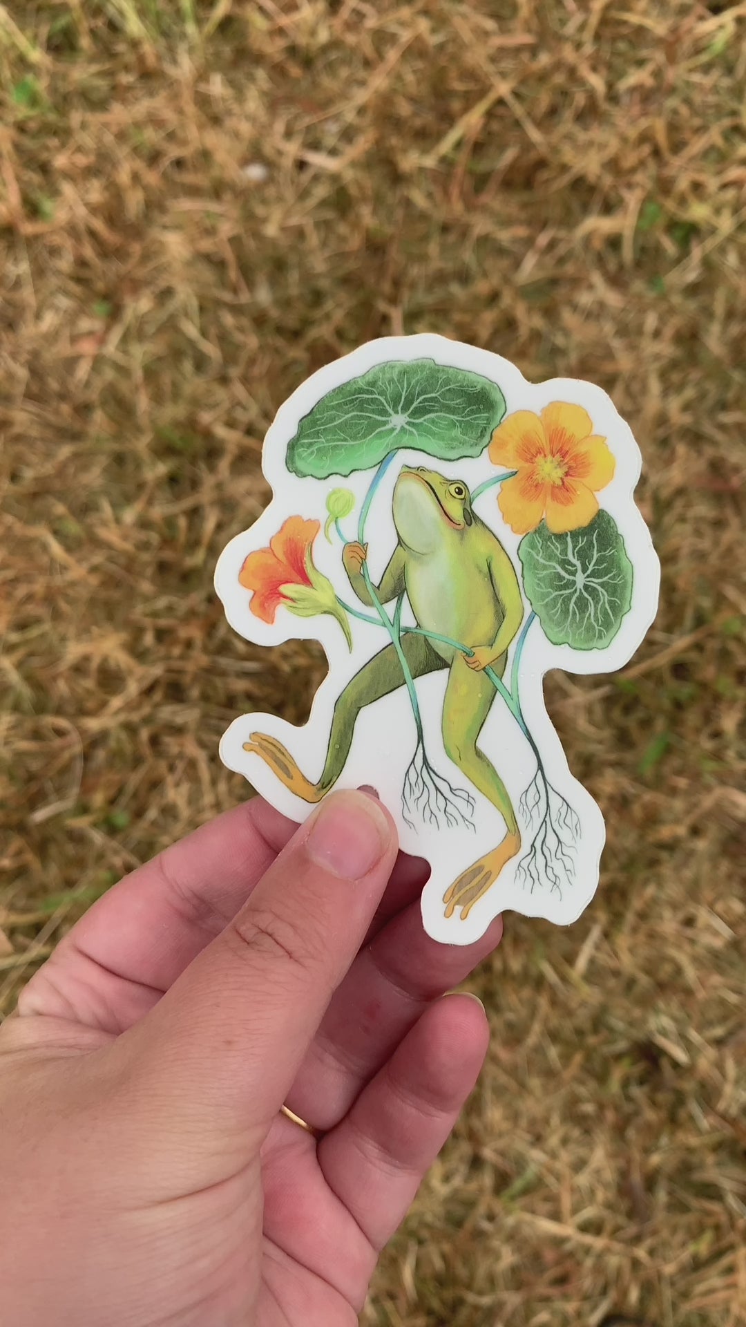 A weatherproof, scratch-resistant, illustrated matte vinyl sticker of a happy froggy fella with his handy nasturtium umbrella.