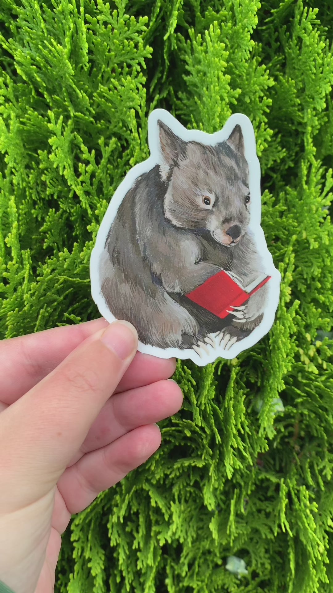 A weatherproof, scratch-resistant, illustrated matte vinyl sticker of a cosy wombat reading a book and wearing slippers.